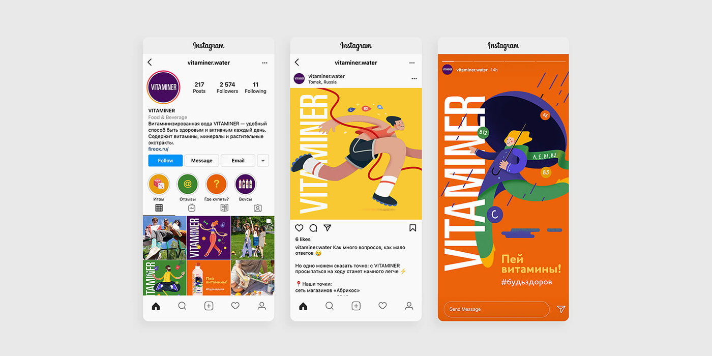 維生素系列的開頭有四種飲料:運(yùn)動(dòng)、放松、免疫、零。每個(gè)人都有自己的口味、自己的維生素和礦物質(zhì)雞尾酒以及自己的性格。在運(yùn)動(dòng)瓶上,一位跑得快的人沖破了終點(diǎn)線;在免疫瓶上,一位不怕感冒的開朗少女在雨中行走。在“放松”中,一個(gè)寧?kù)o的瑜伽士以蓮花姿勢(shì)放松,在“零”中,一個(gè)健康的女孩清楚地監(jiān)控飲食中的糖分含量,開始訓(xùn)練。