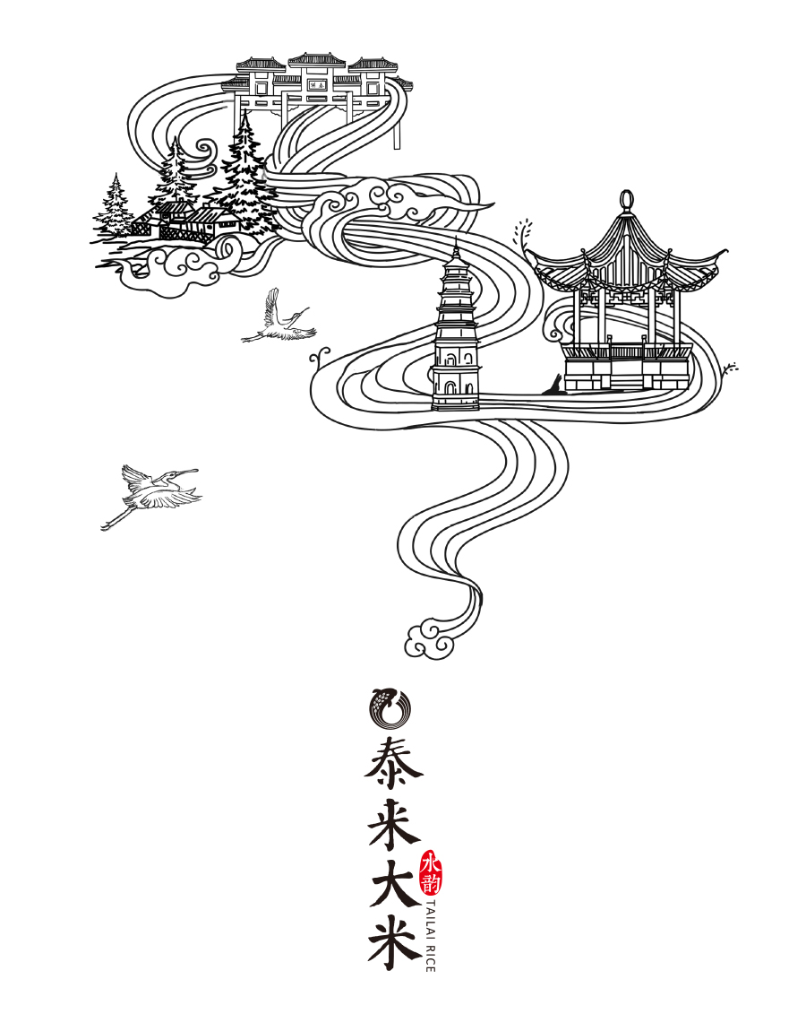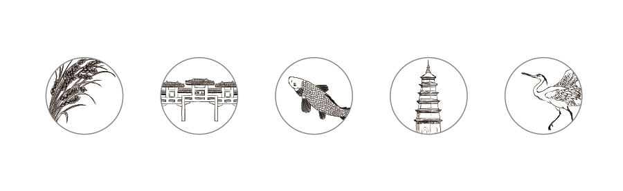 選用大米 / 稻谷 / 魚(yú) / 遼塔 / 鷺 等元素進(jìn)行塑造