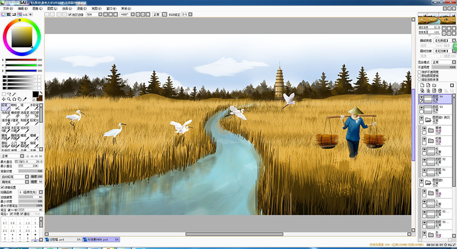 西林插畫(huà)師從“水韻”中提取元素,著重描繪水的流動(dòng)性,以線條為主,體現(xiàn)復(fù)古風(fēng)格。插畫(huà)中穿插泰來(lái)縣特有的文化標(biāo)志建筑,與插畫(huà)形成統(tǒng)一,實(shí)現(xiàn)“水韻”這一主題。