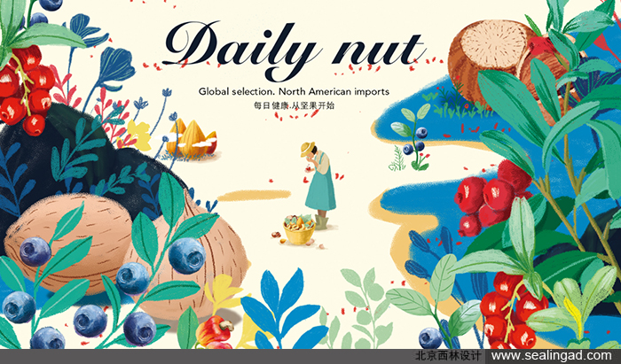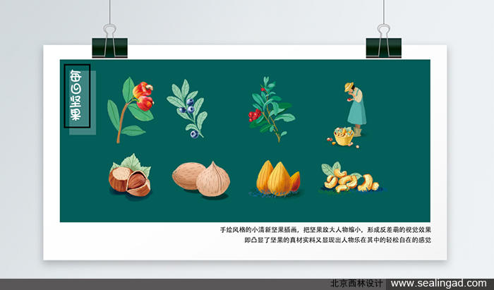 包裝插畫:手繪風(fēng)格的小清新堅(jiān)果插畫,把堅(jiān)果放大,人物縮小,形成反差萌的禮堂效果,即突顯了堅(jiān)果的真材實(shí)料,又顯現(xiàn)出人物樂在其中