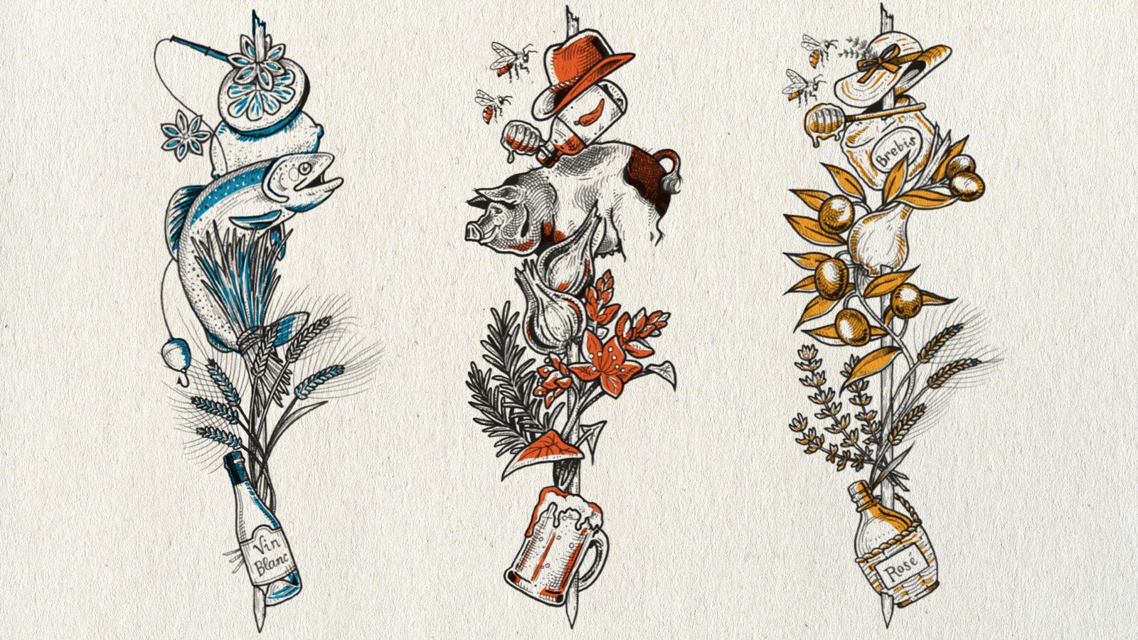 這些盒子分布在葡萄酒商店和熟食店,采用三種傳統(tǒng)設(shè)計(jì)(魚,肉和蔬菜)來(lái)象征當(dāng)?shù)?。三個(gè)圖案,三個(gè)精美插圖和“好心情”顏色編碼清晰地呈現(xiàn)了每個(gè)設(shè)計(jì)和每個(gè)互補(bǔ)的風(fēng)味。