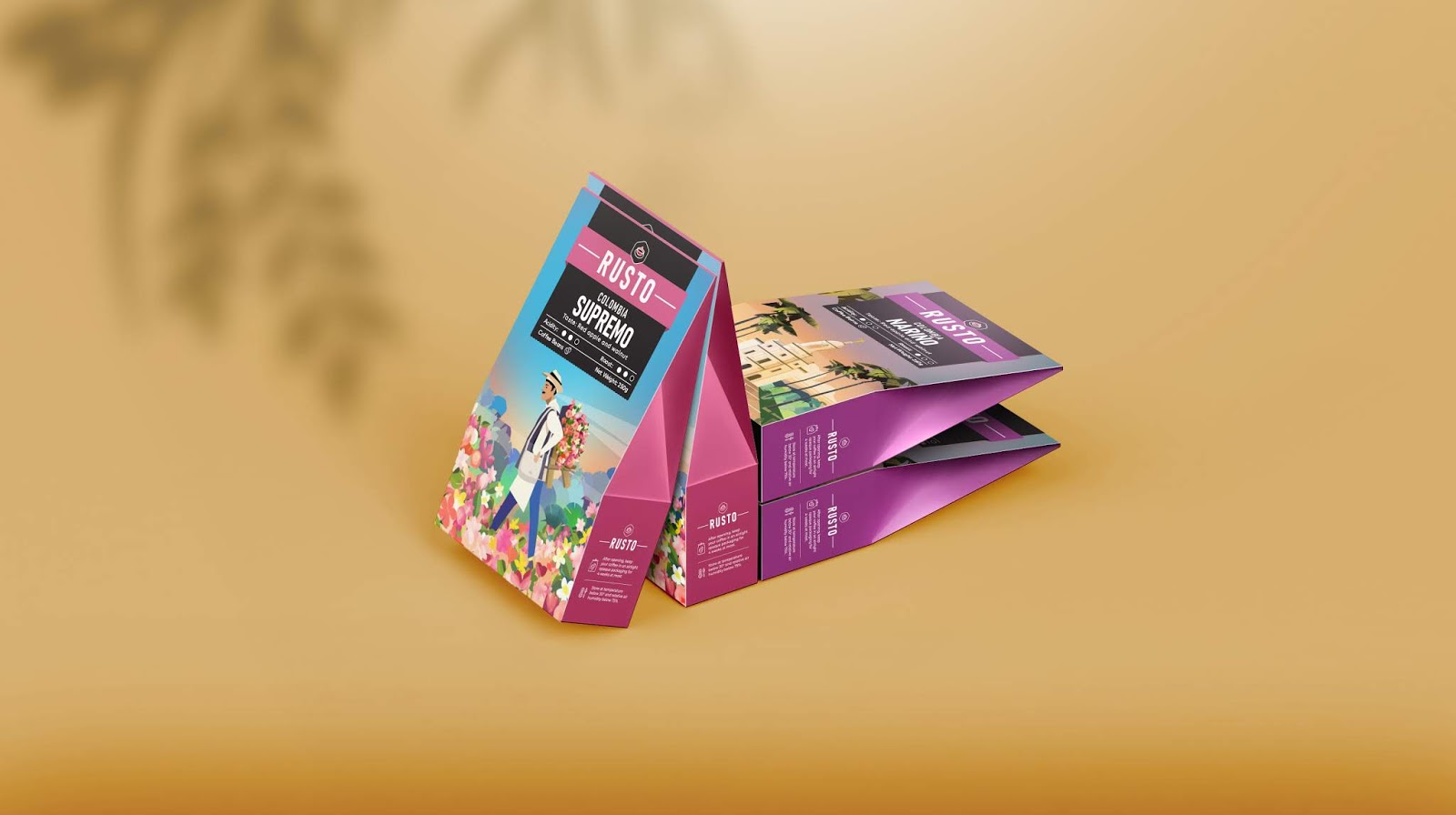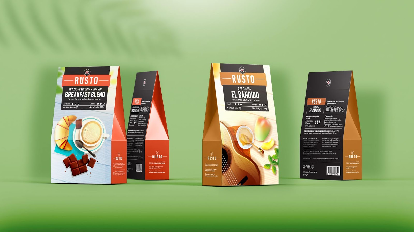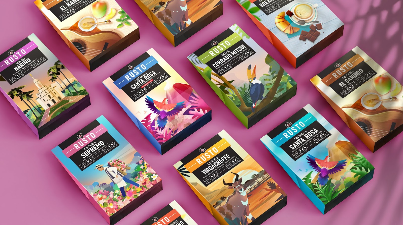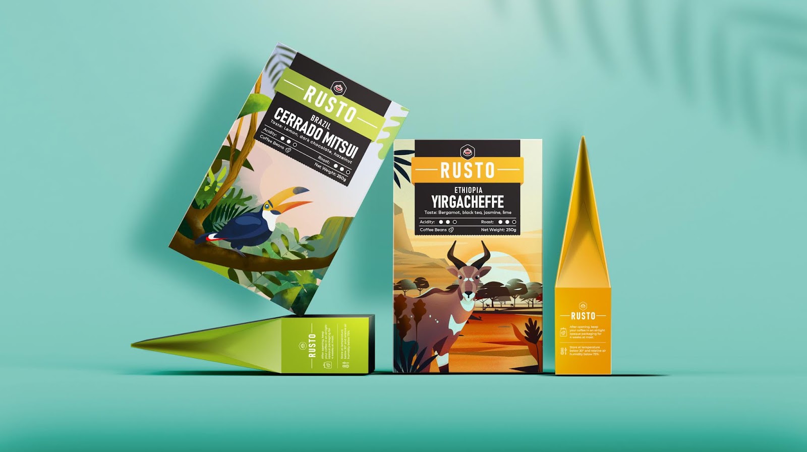 The result: We worked in a collaborative way with Rusto’s owner to get to the final result. Overall we used bright colors and illustrations that are predominant in order to increase the coffee’s visibility on the shelf. This way we managed to make Rusto an accomplished and modern brand that stands compared to it’s competition.
