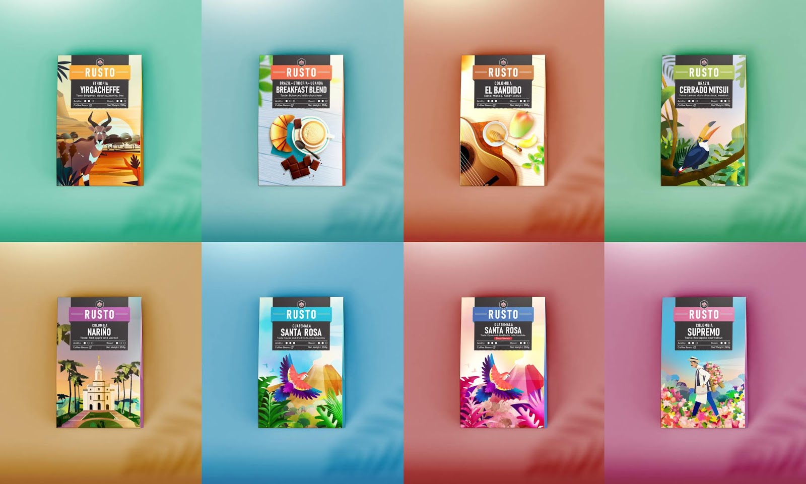 例如,我們使用尼亞拉山為埃塞俄比亞,麥德林的花卉節(jié)為哥倫比亞。我們?yōu)榘臀髅枥L了圖坎火山,為危地馬拉描繪了一只鸚鵡。我們還對(duì)咖啡進(jìn)行了顏色編碼,以區(qū)分不同類型的咖啡。顏色代碼在徽標(biāo)和包裝的兩側(cè)。對(duì)于標(biāo)志,我們使用了一個(gè)簡(jiǎn)單的粗體字體,完成了一個(gè)精致的咖啡杯符號(hào)頂部。因此,它變得更加引人注目和可讀性。