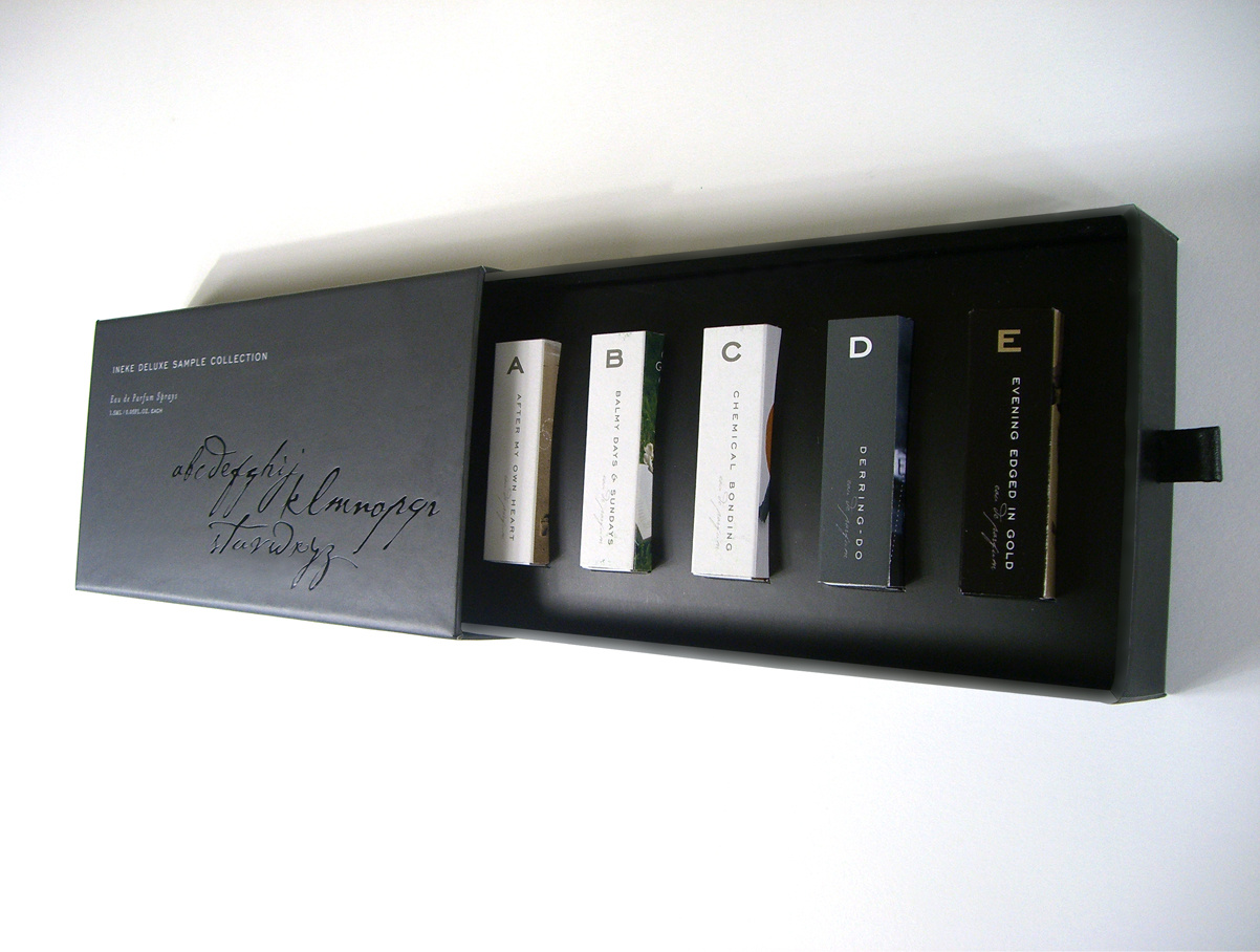 Ineke Deluxe Sample Collection通過高檔抽屜盒包裝展示了Ineke香水的微型版本。在每個采樣器中,小瓶都用柔軟的薄紙包裹著,并裝在(抽拉盒)火柴盒中。