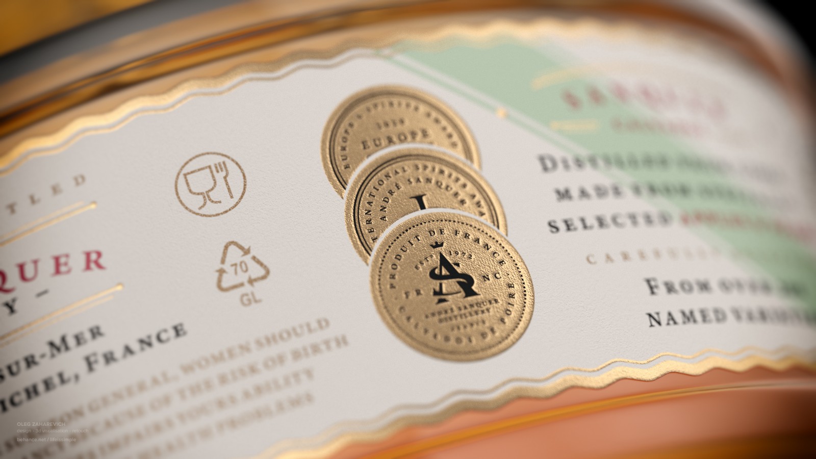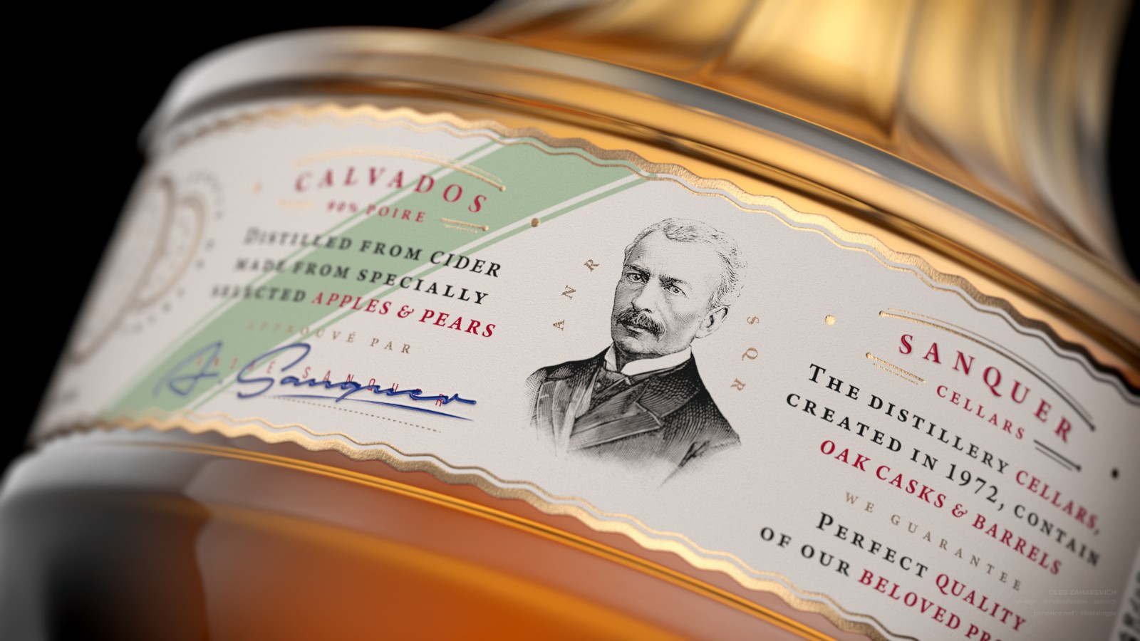 卡爾瓦多斯酒是一種具有三個(gè)主要產(chǎn)區(qū)的烈酒,其中一個(gè)主要是通過梨的蒸餾制成的。在研究這種法國精神時(shí),Oleg Zaharevich創(chuàng)建了一個(gè)虛構(gòu)的calvados品牌SANQUER。他使用CGI開發(fā)了品牌標(biāo)識(shí),在瓶子的形狀和標(biāo)簽上放置了特定的細(xì)節(jié)。為了反映烈酒的主要成分,他制作了一個(gè)梨形的瓶子,它的脖子和圓潤的身體細(xì)長。他使用金箔數(shù)字化設(shè)計(jì),將細(xì)線和圓圈組合在一起,優(yōu)雅地設(shè)計(jì)了標(biāo)簽。包括極簡主義的窄幅法國國旗標(biāo)志,以進(jìn)一步強(qiáng)調(diào)該虛構(gòu)品牌的歷史和文化。