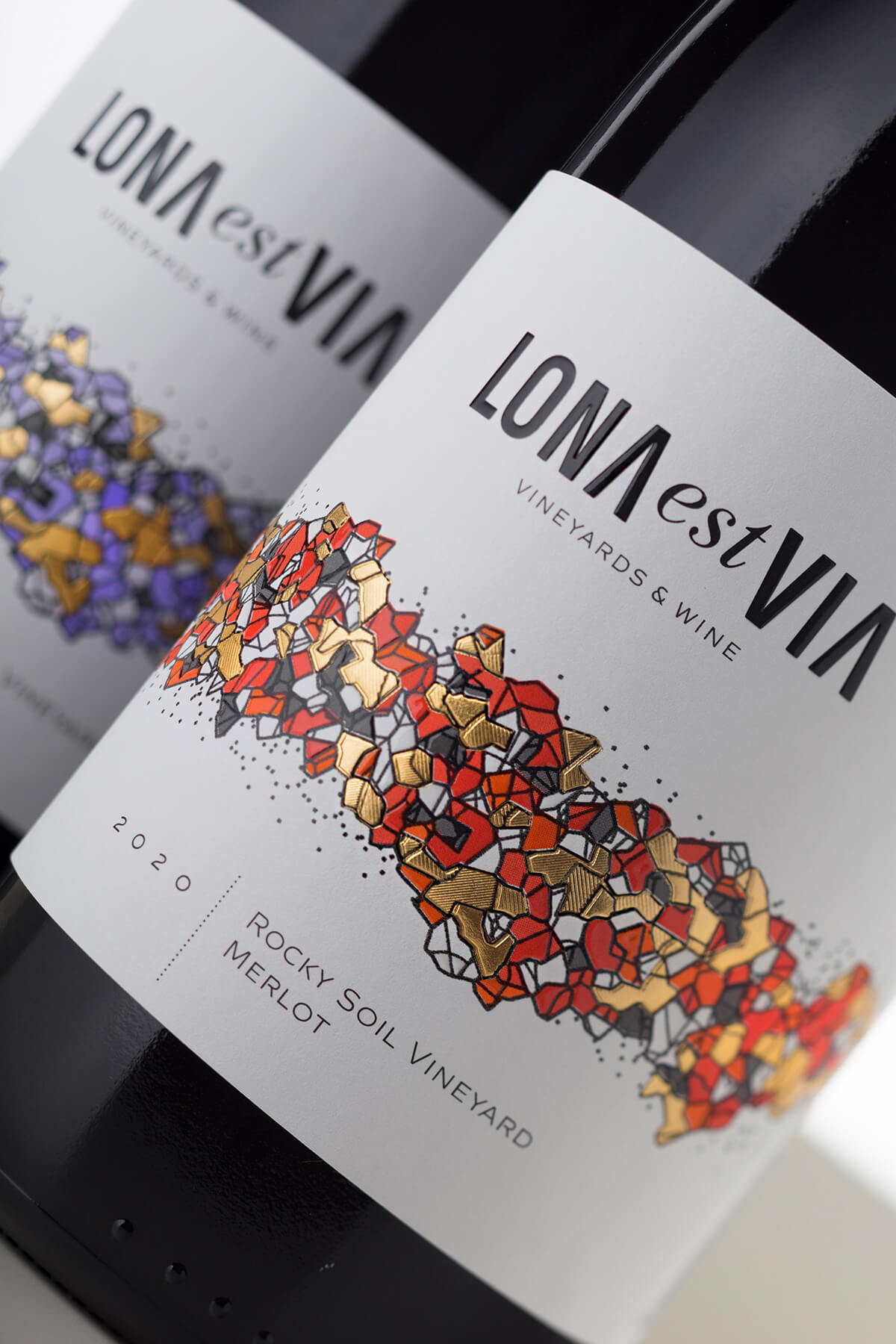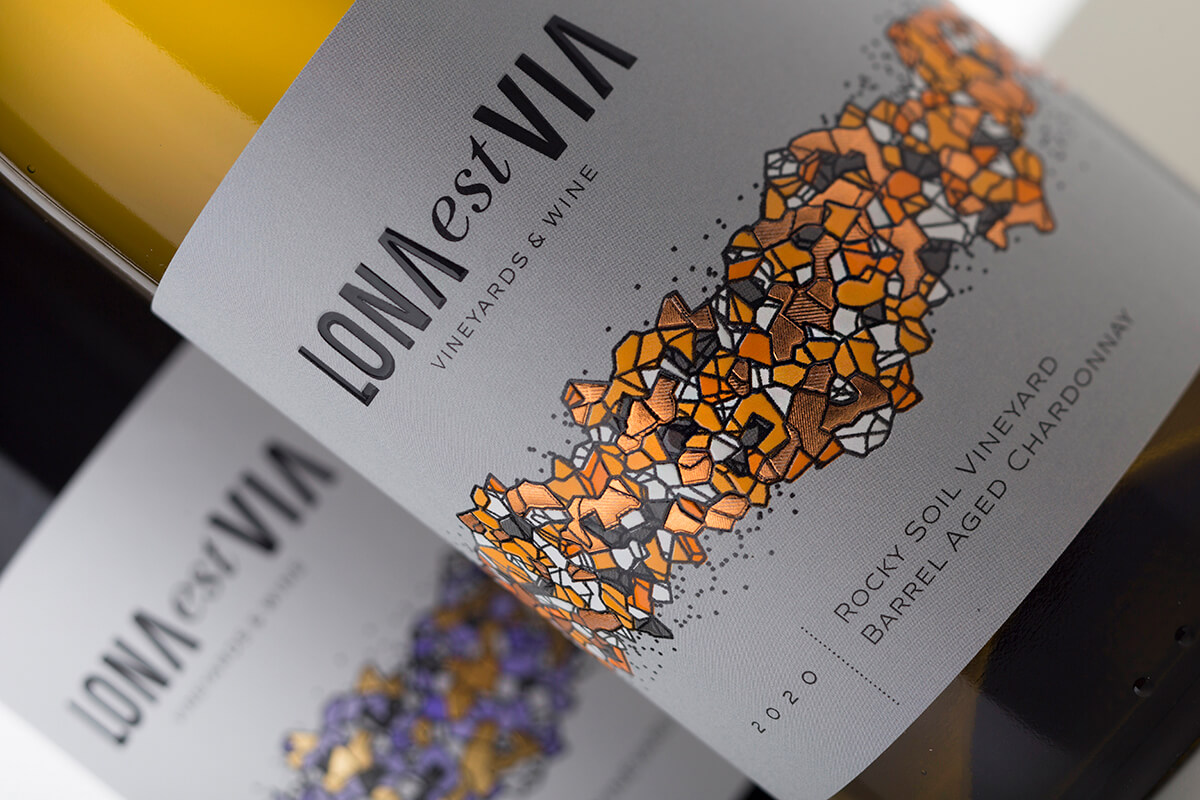 為了增強(qiáng)所有這些反射,我在每塊印有熱箔的石頭上使用了微壓花和強(qiáng)力壓花,而另一個(gè)用墨水印刷的則在上面涂上了凸起的清漆,這樣最后整個(gè)條紋看起來(lái)像一個(gè) 3D 圖像,尤其是在不同的光線條件下. 我的主要想法是在這個(gè)包裝標(biāo)簽中創(chuàng)建非常吸引人的彩色條紋,以便人們可以輕松記住它。我還想大聲說(shuō),這些石頭是 Sredno Gradishte 村周?chē)@片神奇風(fēng)土的真正寶藏。標(biāo)簽的頂部中心是“LONA est VIA”標(biāo)題,我使用定制的無(wú)襯線字體和藝術(shù)草書(shū)字母之間的優(yōu)雅組合來(lái)連接 LONA 和 VIA。我想在這個(gè)酒標(biāo)設(shè)計(jì)上有一個(gè)非常清晰易讀的標(biāo)題,但我不想看起來(lái)很簡(jiǎn)單。