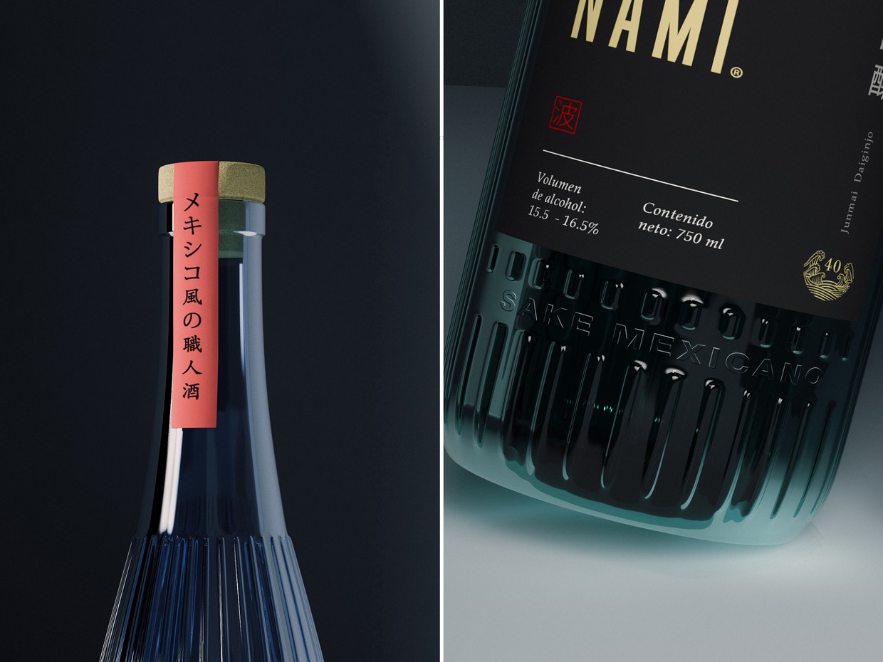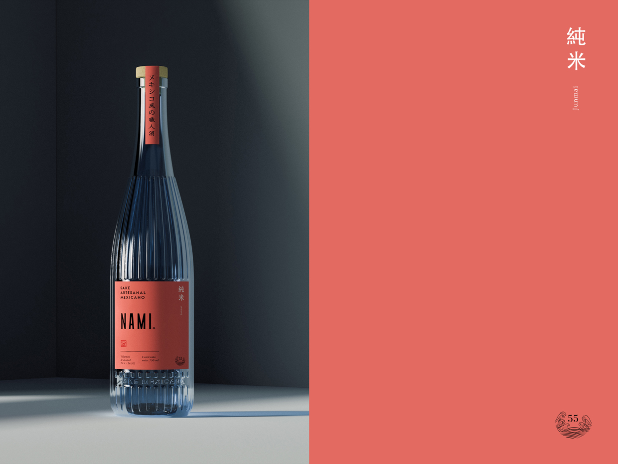 NAMI? 清酒根據(jù)大米的拋光程度分為三個(gè)類別或等級(jí)的清酒。為了區(qū)分它們,我們使用了 3 種不同的玻璃色素和 3 種與玻璃結(jié)合的標(biāo)簽顏色。Jumnai 以藍(lán)色玻璃色和墨西哥粉紅色標(biāo)簽表示,其次是 Junmai Ginjo,它在玻璃上使用綠色旗幟,與標(biāo)簽主體上的米色形成鮮明對(duì)比,我們以黑色玻璃和黑色標(biāo)簽的 Junmai Daiginjo 高級(jí)類別結(jié)束。金色的觸感賦予它經(jīng)典的感覺(jué)。